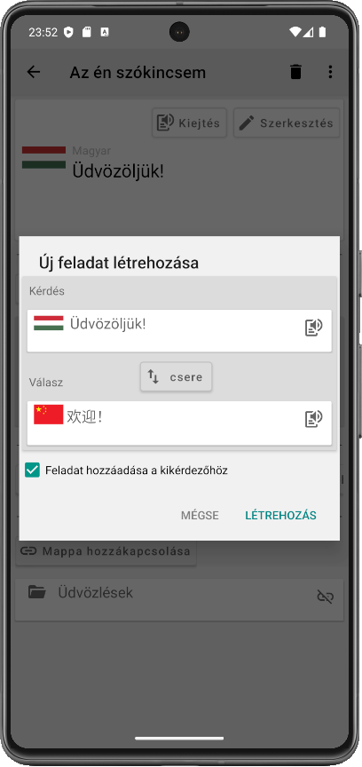 A kapcsolódó feladatok automatikusan megjelennek a mappában, így célzott kikérdezést indíthatsz, amelyben csak azok a szavak szerepelnek, amelyek az adott mappához kapcsolódnak.