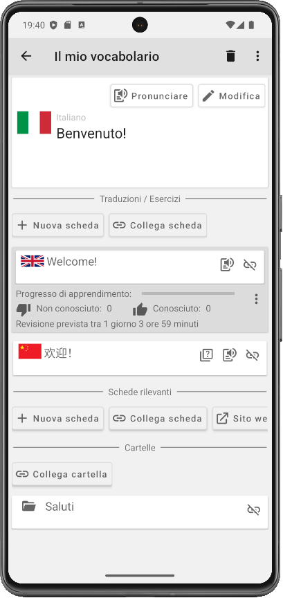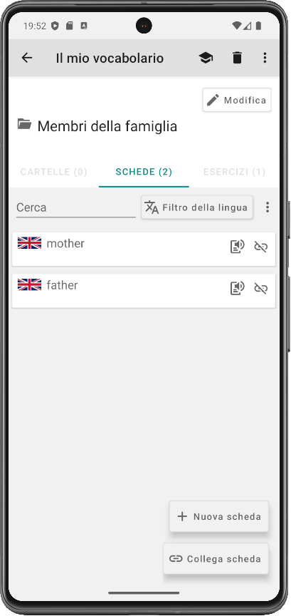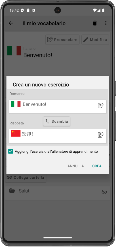 Gli esercizi corrispondenti vengono visualizzati automaticamente nella cartella, così puoi avviare sessioni mirate in cui vengono richieste solo le parole collegate a quella cartella.